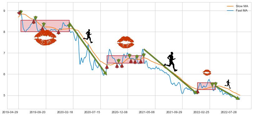 2022-03-29至2022-08-12 慢线与快线呈空头排列, 慢线与快线接触少,无缠绕
