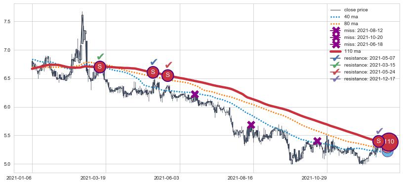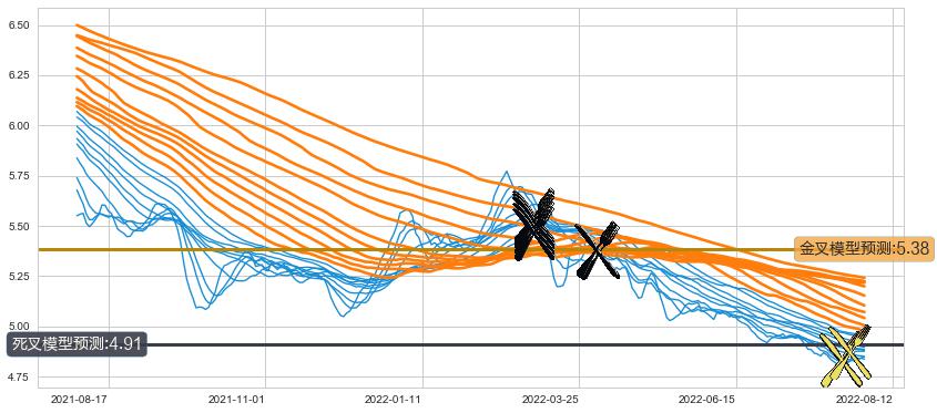 ➣ 60小时均线于(2022-03-04: 5.46)形成【死叉】基于【死叉历史模型】预测死叉后最低波谷价格: 4.98, 死叉后最低价格4.75,已经下跌超出预测最低波谷价格, 预期反弹