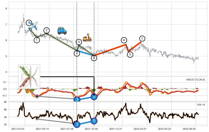 ➣ 第一, 三, 五浪下跌动能逐渐【衰弱变小】,趋势呈现不稳迹象