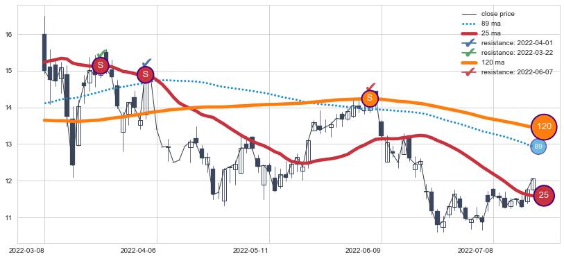 ➣ 180小时均线于(2022-04-04: 13.74)形成【死叉】基于【死叉历史模型】预测死叉后最低波谷价格: 11.21, 死叉后最低价格10.80,已经下跌超出预测最低波谷价格, 预期反弹
