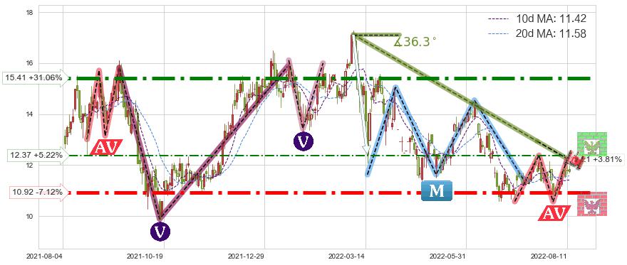 ♘ 阻力价格位12.37,可信任强度47.71%,距离最后交易2022-08-12形成的收盘价格11.76相差 +5.22%