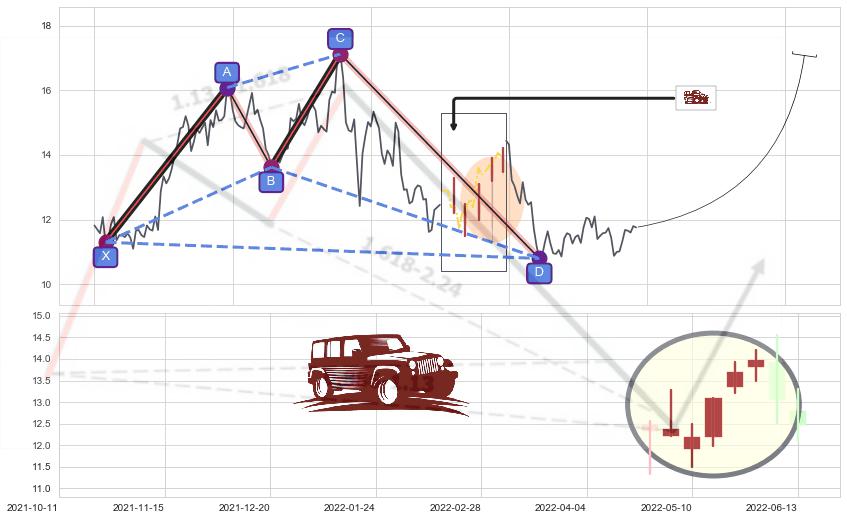 ➢ 谐波鲨鱼:c下跌到达d:猜想拉升 → 上涨 →【拐点】强支撑临近 → 大趋势均值回复