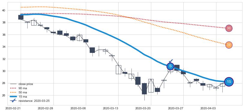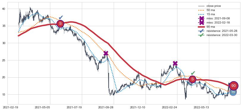 📝 多条均线形成死叉后走势最低价格达到: 13.86