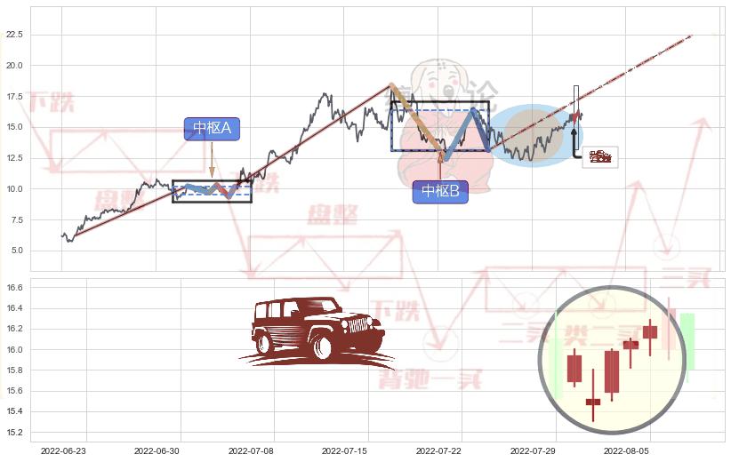 ➣ 【中枢B】:2021-10-15-2022-03-15,中枢由4笔构成,共104交易日, ZG=16.38, ZD=13.12