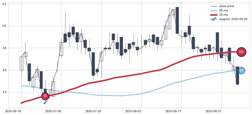 ➢ 55小时均线于(2022-06-30: 2.489)形成【死叉】基于【死叉历史模型】预测死叉后最低波谷价格: 1.8129, 死叉后最低价格1.9700,尚未达到预测最低波谷价格, 预期继续下跌