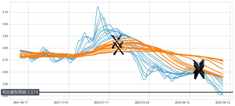 ➣ 40小时均线于(2022-06-30: 2.502)形成【死叉】基于【死叉历史模型】预测死叉后最低波谷价格: 2.052, 死叉后最低价格1.9700,已经下跌超出预测最低波谷价格, 预期反弹