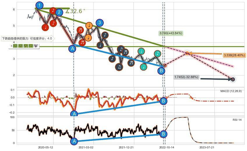 ♘ 在最后的下跌阶段2020-01-02至2022-08-12,存在 持续未破位的阻力位 ,阻力价格3.740,可信任强度85.43%,其距离最后价格2.600相差 +43.84%