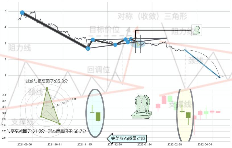 ➣ 下跌螺旋桨 + 下降对称三角整理支撑破位转换阻力下跌信号叠加后【目标达成率】极低,【看空】信号叠加【存续影响极大】