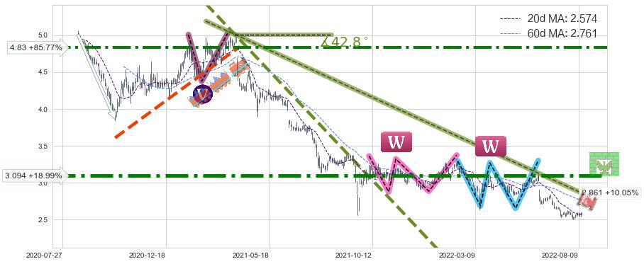 ♘ 阻力价格位3.094,可信任强度89.75%,距离最后交易2022-08-12形成的收盘价格2.600相差 +18.99%