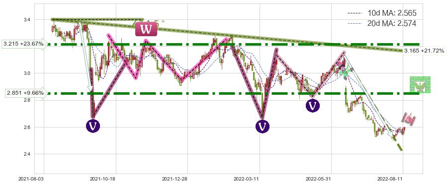 ♘ 阻力价格位2.851,可信任强度86.22%,距离最后交易2022-08-12形成的收盘价格2.600相差 +9.66%
