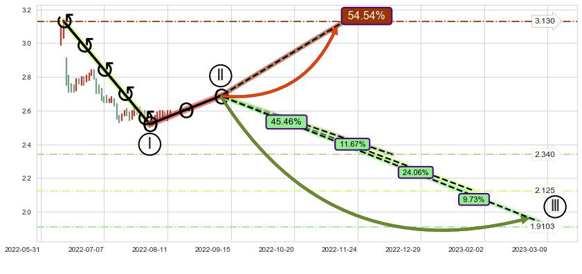 ➣ 循环浪继续向下【平均值】位置(2023-01-27, 2.125),匹配聚类样本比例52.93%, 可能性概率24.06%