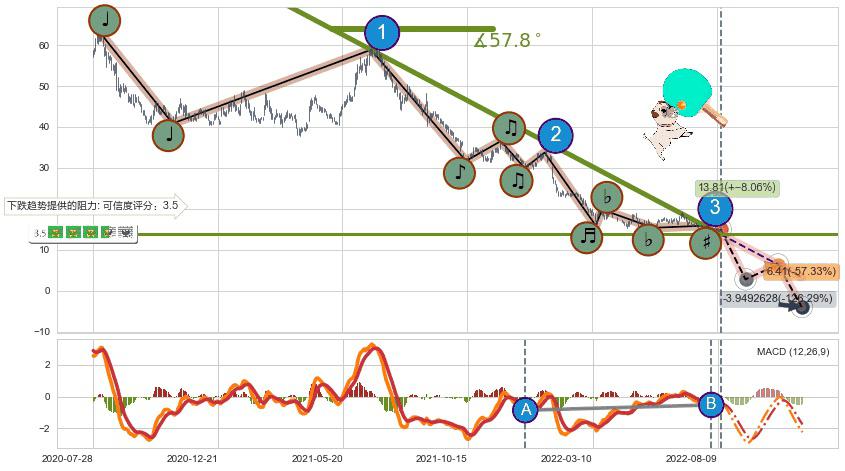 ♘ 在最后的下跌阶段2020-08-05至2022-08-12,存在 破位边缘的阻力位 ,阻力价格13.81,可信任强度79.83%,其距离最后价格15.02相差 -8.06%