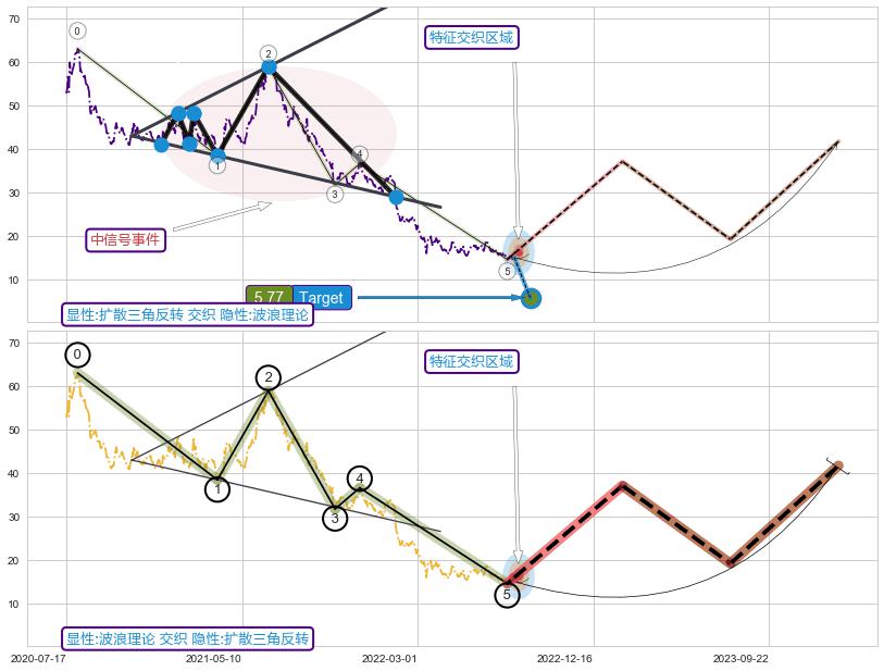 ➣ 扩散三角反转:猜想预期下跌目标target即将达成,随后猜想强支撑来临,预期反弹上涨(均值回复)
