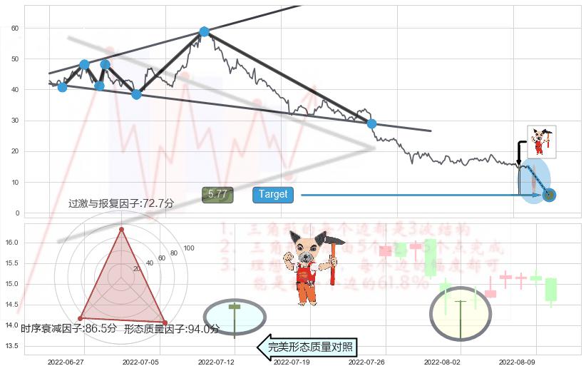 ➢ 趋势线下跌趋势面临突破上涨 🔜 扩散三角反转临近target支撑拐点上涨 综合量化分数:51.88 【中性】