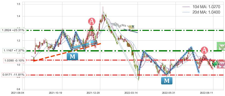 ♘ 支撑价格位0.9171,可信任强度67.01%,距离最后交易2022-08-12形成的收盘价格1.0400相差 -11.81%