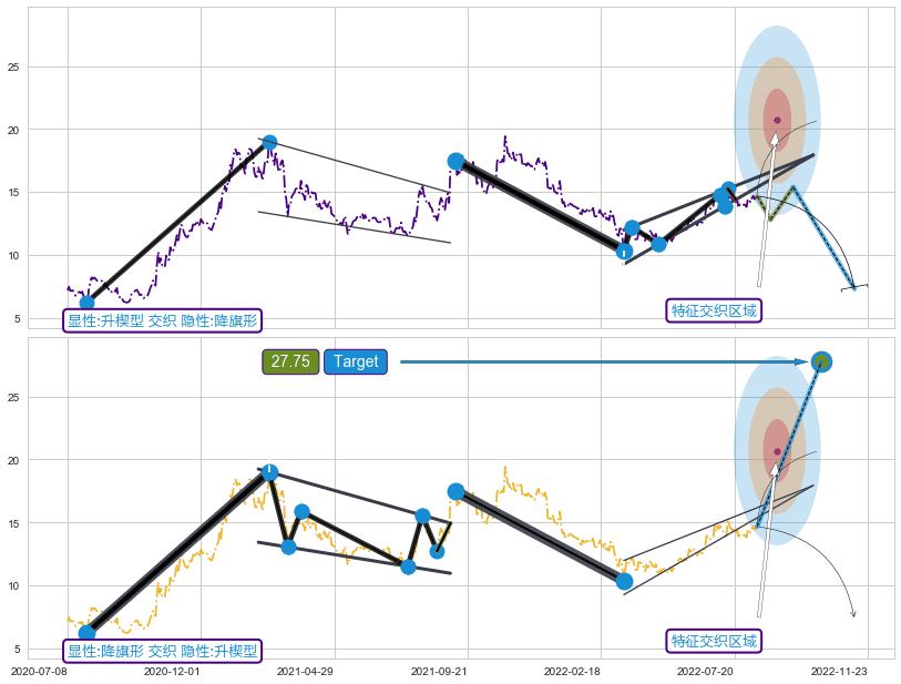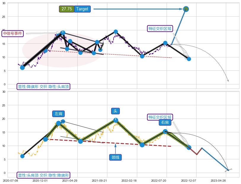➣ 看跌(高位倒锤头)流星线 + 降旗形临近target阻力拐点下跌信号叠加后【目标达成率】低,【看空】信号叠加【存续影响大】