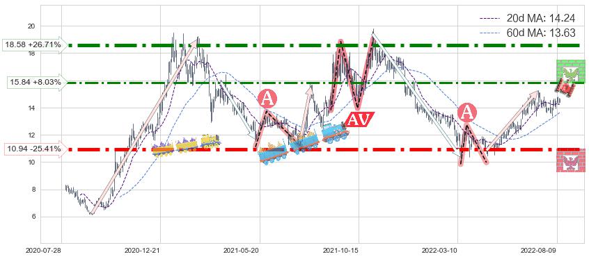 ♘ 阻力价格位15.84,可信任强度57.66%,距离最后交易2022-08-12形成的收盘价格14.66相差 +8.03%
