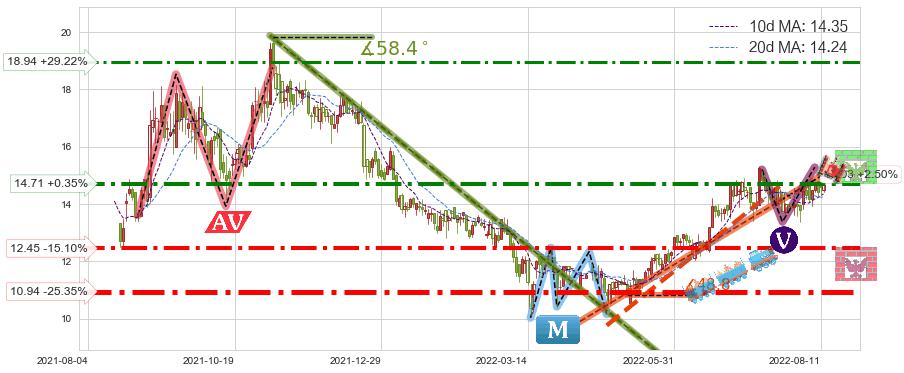 ➢ 【仅预测突破】最后价格:14.66与预测突破价格:13.26→【空间中等】后续最小【反转】第一目标价格→(2022-09-07: 11.90 )