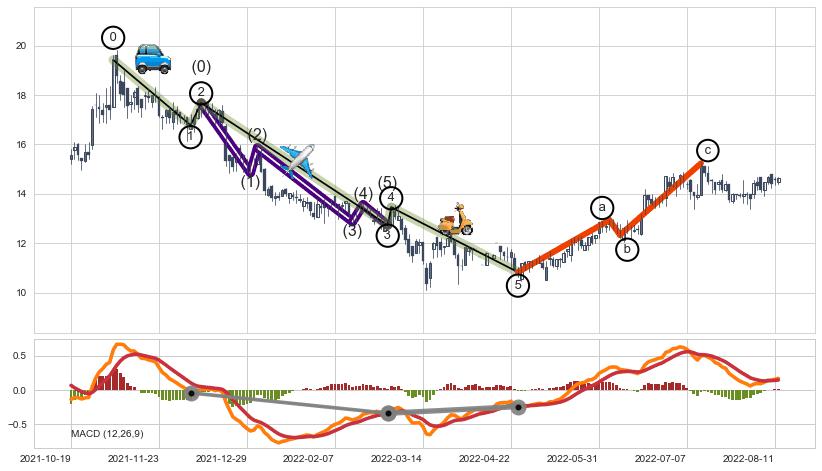 ➣ 波浪理论:猜想达到c点后小反弹终止反转下跌 → 下跌 → 【拐点】临近 → 阶段均值回复结束后继续大周期趋势跟踪