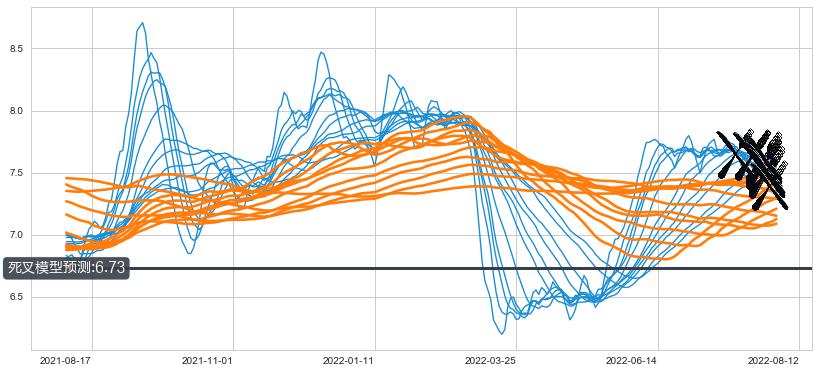 ➣ 60小时均线于(2022-08-08: 7.51)形成【死叉】基于【死叉历史模型】预测死叉后最低波谷价格: 6.49, 死叉后最低价格7.19,尚未达到预测最低波谷价格, 预期继续下跌