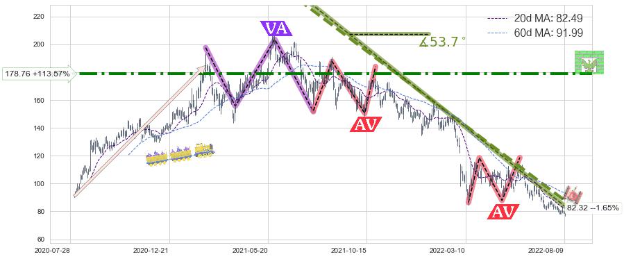 从2021-05-27至2022-08-12,共包含299个交易日,阶段股价下跌-79.17%,阶段股价变动位移路程比: 1 : 8,下跌趋势角度: 50.6