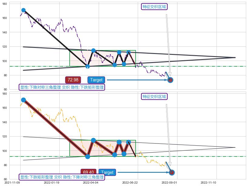 ➢ 下降对称三角整理:猜想预期下跌目标target即将达成,随后猜想强支撑来临,预期反弹上涨(均值回复)