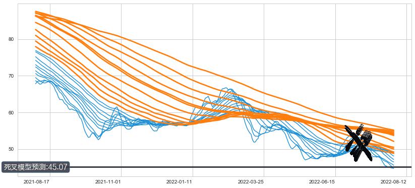 ➣ 34小时均线于(2022-07-13: 50.56)形成【死叉】基于【死叉历史模型】预测死叉后最低波谷价格: 44.99, 死叉后最低价格43.70,已经下跌超出预测最低波谷价格, 预期反弹