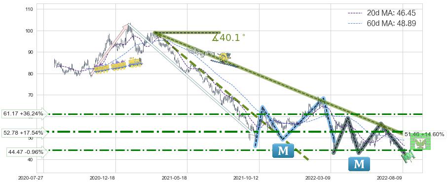 ♘ 阻力价格位52.78,可信任强度80.42%,距离最后交易2022-08-12形成的收盘价格44.90相差 +17.54%
