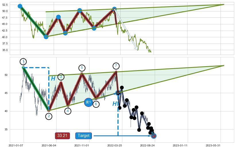➣ 升楔型:猜想下跌target达成后 → 上涨 → 机会信号 → 大趋势均值回复