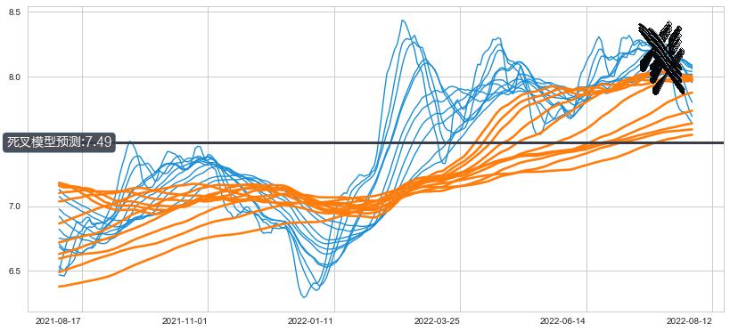➣ 70小时均线于(2022-07-29: 8.03)形成【死叉】基于【死叉历史模型】预测死叉后最低波谷价格: 7.28, 死叉后最低价格7.54,尚未达到预测最低波谷价格, 预期继续下跌