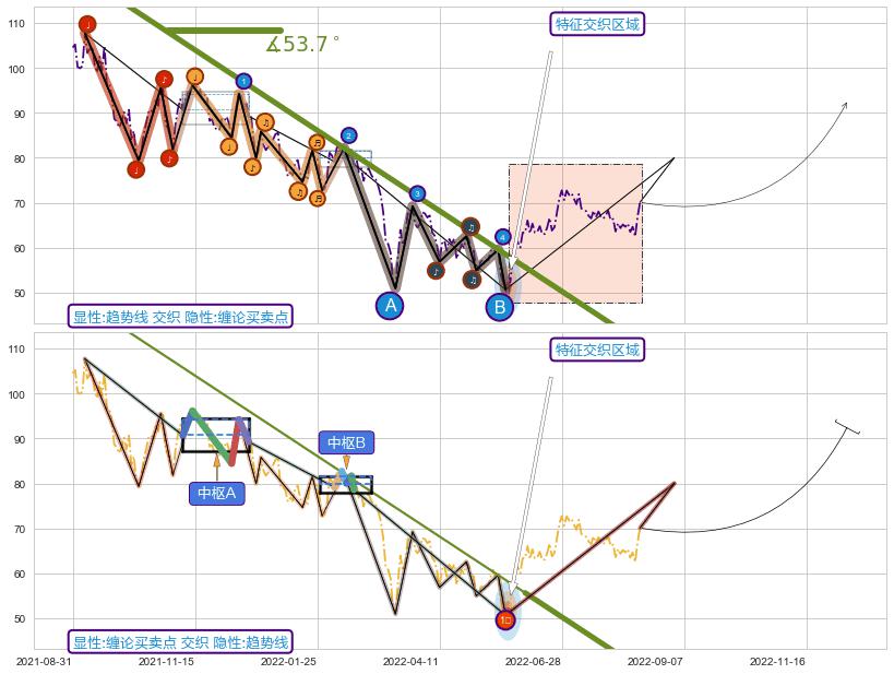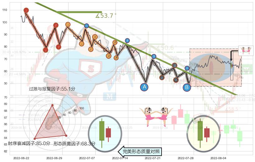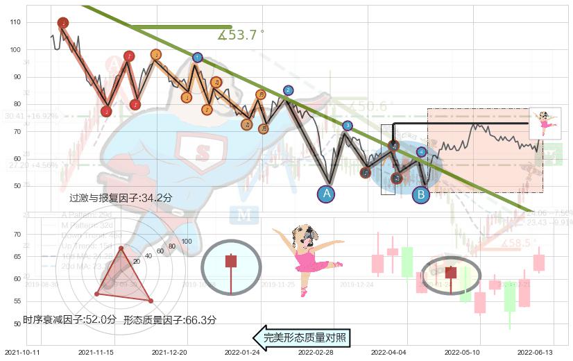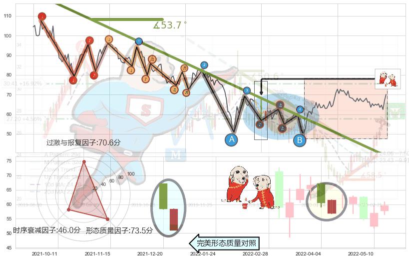 从2021-11-12至2022-02-10,共包含61个交易日,阶段股价下跌-12.69%,阶段股价变动位移路程比: 1 : 10,下跌趋势角度: 57.1