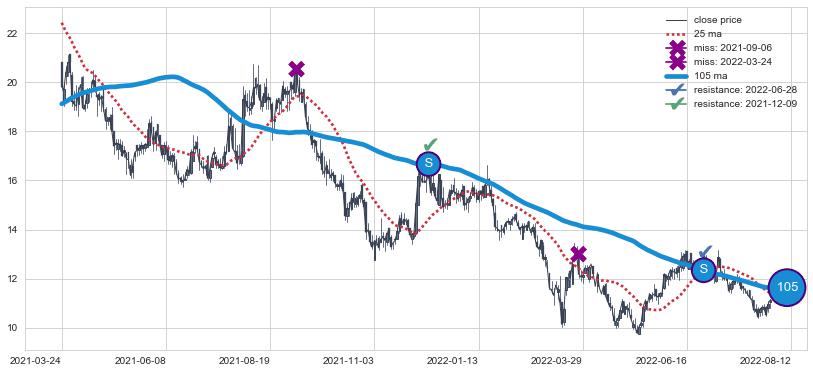 ➣ 25小时均线于(2022-07-08: 12.48)形成【死叉】基于【死叉历史模型】预测死叉后最低波谷价格: 11.38, 死叉后最低价格10.44,已经下跌超出预测最低波谷价格, 预期反弹