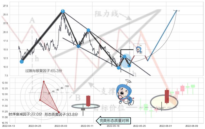 ➣ 上涨螺旋桨形态 + 降楔型临近阻力猜想转换支撑上涨信号叠加后【目标达成率】中等,【看多】信号叠加【存续影响中等】