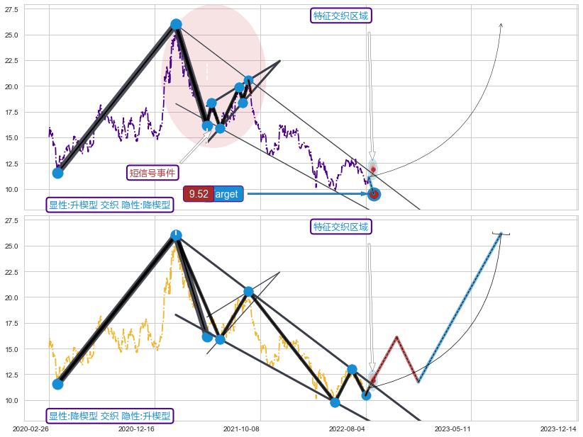 ➣ 旭日东升 + 升楔型临近target支撑拐点上涨信号叠加后【信号初始稳固度】高,【看多】信号叠加【可信度影响大】