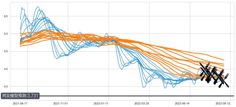 ➣ 60小时均线于(2022-08-03: 4.28)形成【死叉】基于【死叉历史模型】预测死叉后最低波谷价格: 3.627, 死叉后最低价格4.10,尚未达到预测最低波谷价格, 预期继续下跌