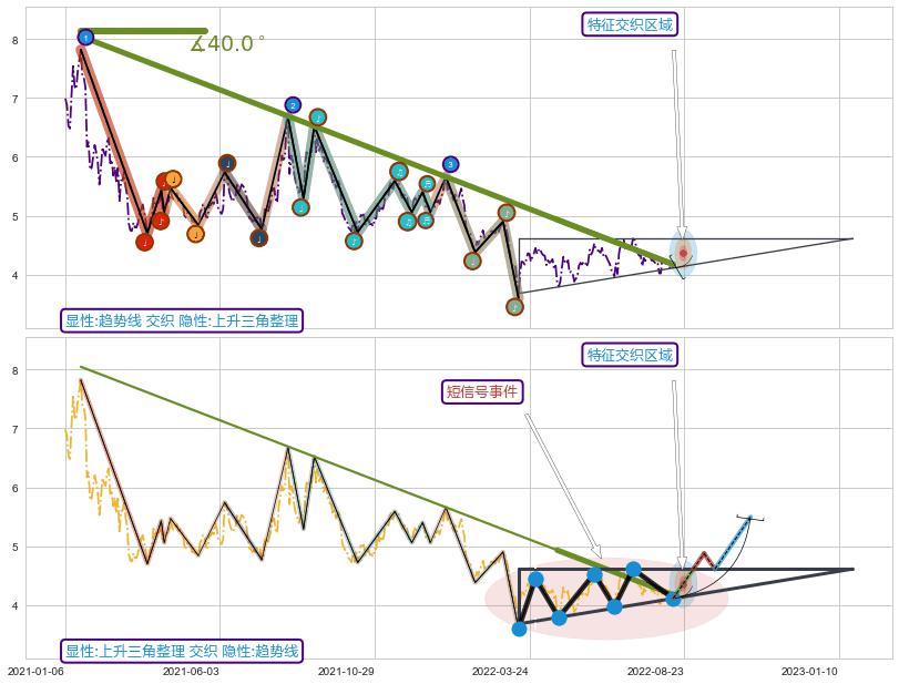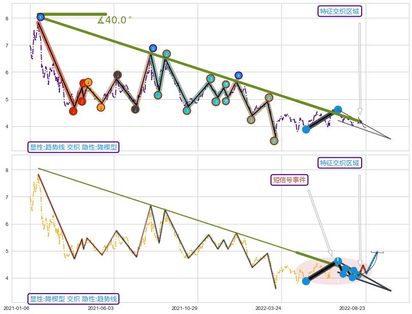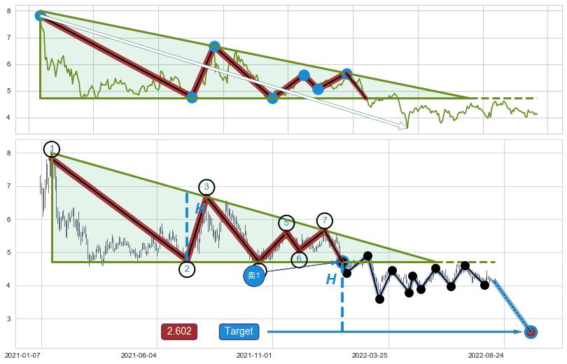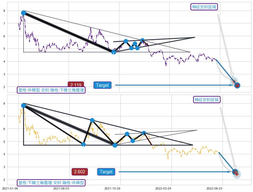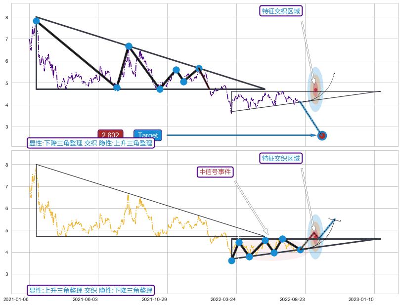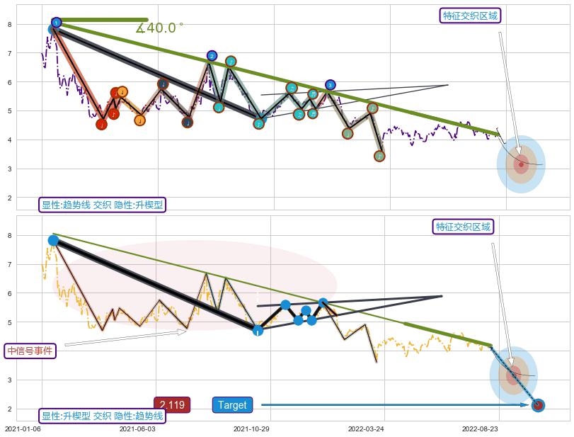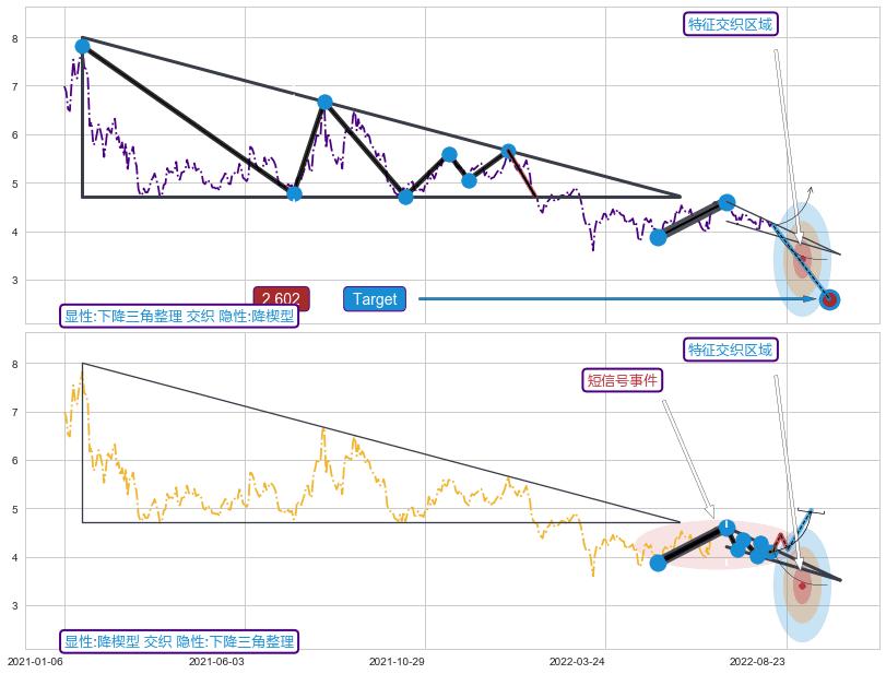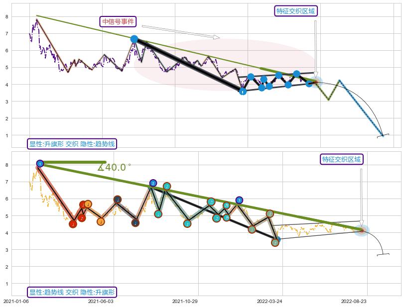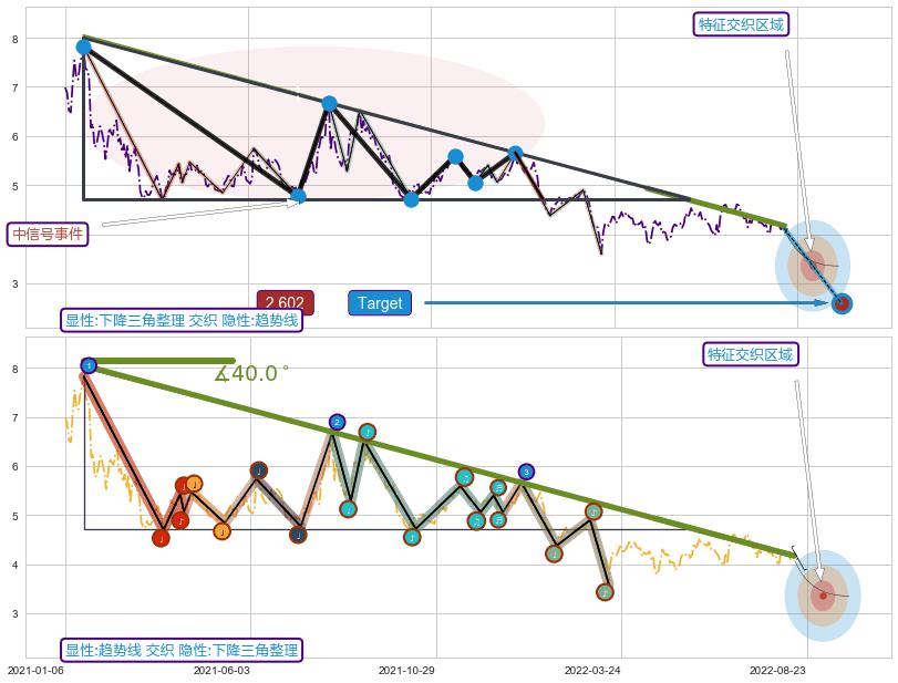 ➢ 【多方力量耗尽,空方打破攻守平衡点】下降三角形中继整理, 已在2022-01-25突破【支撑】颈线 4.72 →演变成下降通道