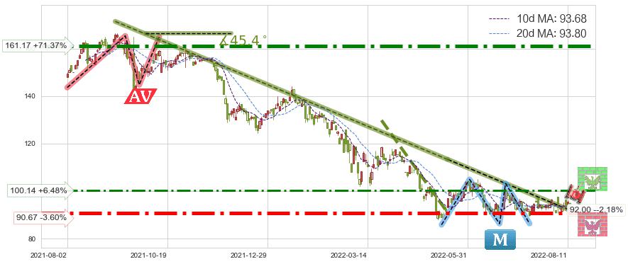 ♘ 阻力价格位100.14,可信任强度63.96%,距离最后交易2022-08-12形成的收盘价格94.05相差 +6.48%