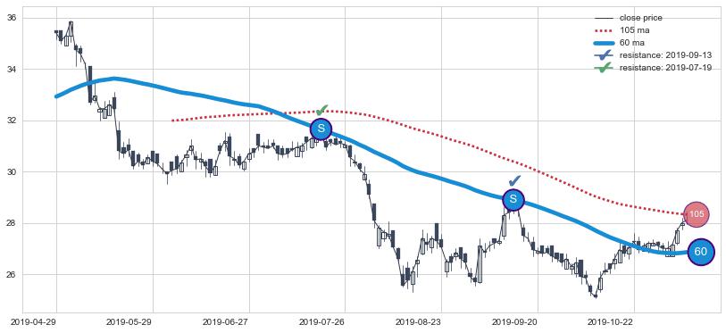 ➢ 最优均线组合共正确确认支撑阻力信号5处,正确确认率 71.43%