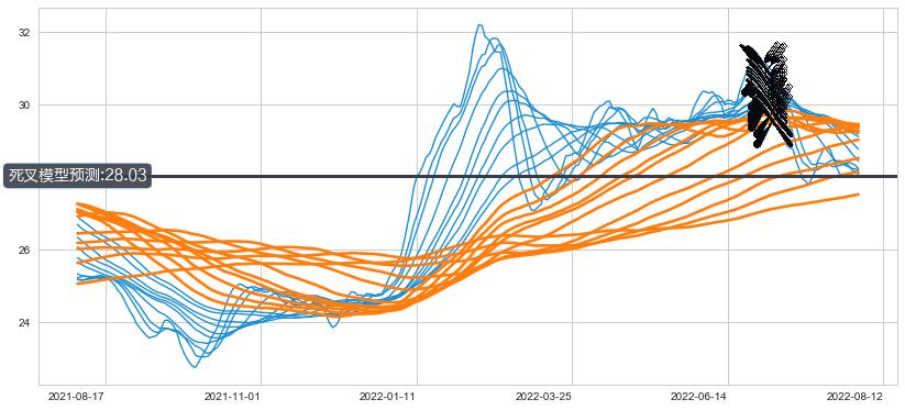 ➣ 70小时均线于(2022-07-05: 29.80)形成【死叉】基于【死叉历史模型】预测死叉后最低波谷价格: 27.66, 死叉后最低价格27.50,虽然已经到达预测最低波谷价格,但耗时间很短动能很强, 预期继续下跌