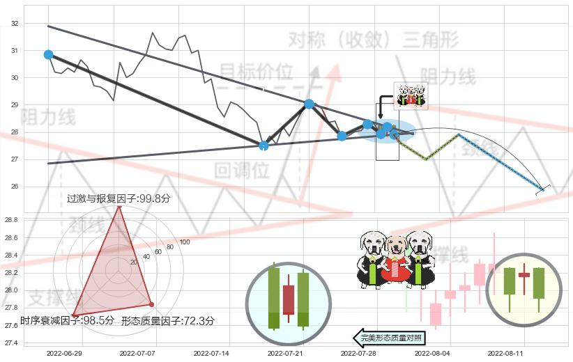 ➣ 【未确认突破,预测即将形成突破】下降【对称】三角形整理起点:2022-05-27, 预测突破点:2022-08-12,形态共54交易日