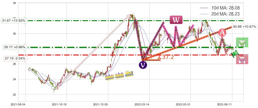 ♘ 支撑价格位27.19,可信任强度68.30%,距离最后交易2022-08-12形成的收盘价格27.90相差 -2.54%