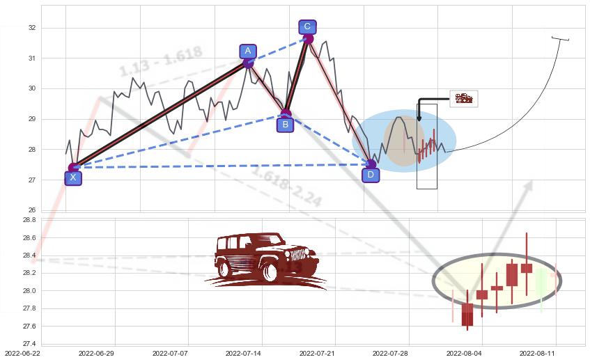 ➣ 谐波鲨鱼:已到达d点:猜想c下行到达d点后报复性拉升上涨(均值回复)