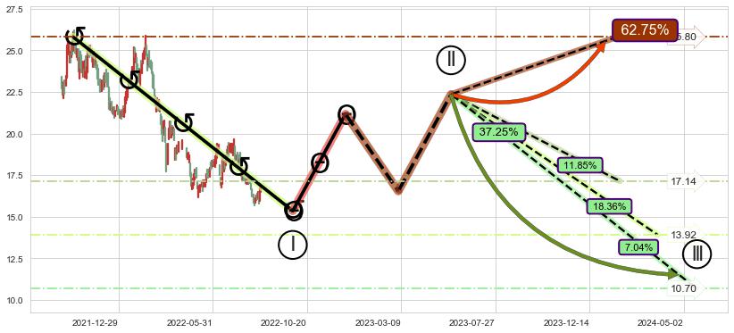 ➣ 循环浪继续向下【平均值】位置(2024-03-25, 13.92),匹配聚类样本比例49.30%, 可能性概率18.36%