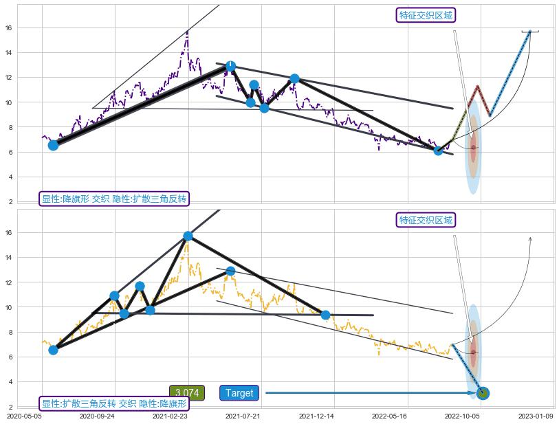 ➢ 扩散三角反转:猜想预期下跌目标target即将达成,随后猜想强支撑来临,预期反弹上涨(均值回复)