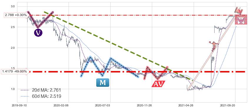 ♘ 支撑价格位2.788,可信任强度53.86%,距离最后交易2021-09-24形成的收盘价格2.780相差 +0.30%