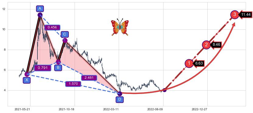 ➢ 谐波蝴蝶:c下跌到达d:猜想拉升 → 上涨 →【拐点】强支撑临近 → 大趋势均值回复