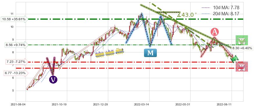 ♘ 支撑价格位7.23,可信任强度67.85%,距离最后交易2022-08-12形成的收盘价格7.80相差 -7.27%
