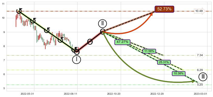 ➢ 循环浪继续向下【最低】位置(2023-03-01, 5.25),匹配聚类样本比例21.96%, 可能性概率10.38%