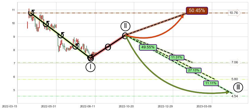 ➣ 循环浪继续向下【平均值】位置(2023-03-15, 5.80),匹配聚类样本比例54.75%, 可能性概率27.13%