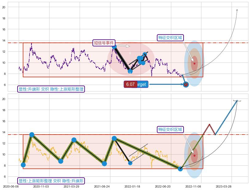 ➣ 上涨身怀六甲 + 升旗形临近target支撑拐点上涨信号叠加后【信号初始稳固度】高,【看多】信号叠加【可信度影响大】